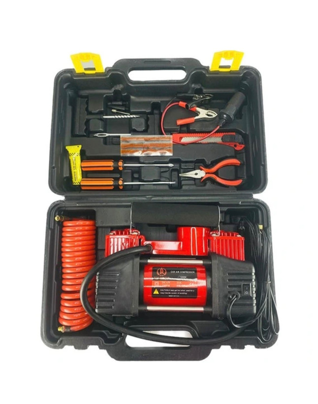 ✔ دارای متعلقات کاربردی؛ شلنگ فنری به طول ۵ متر، دمباریک، کاتر، انبرک های پنچر گیری، پیچ گوشتی دوسو و چهارسو، وصله پنچرگیری، چسب پنچرگیری، تبدیل فندکی به سر باتری خودرو، سه عدد سری (جهت باد زدن توپ، دوچرخه، قایق بادی و ...)